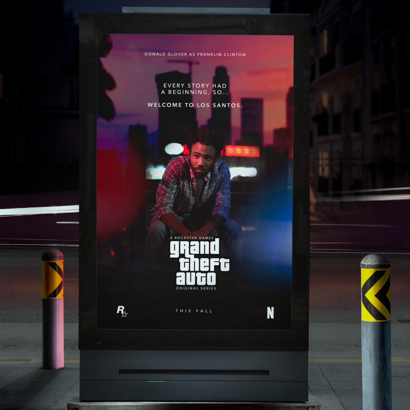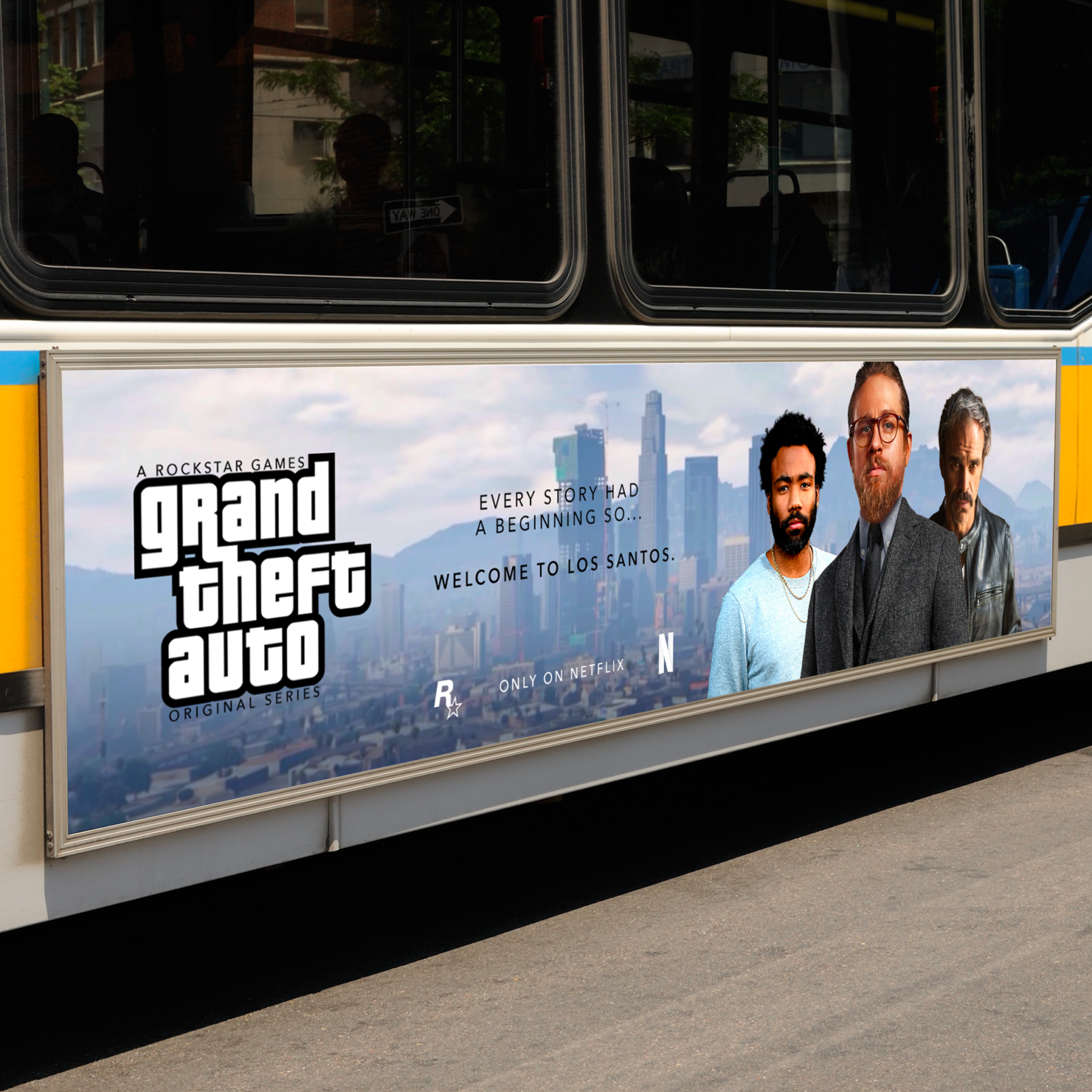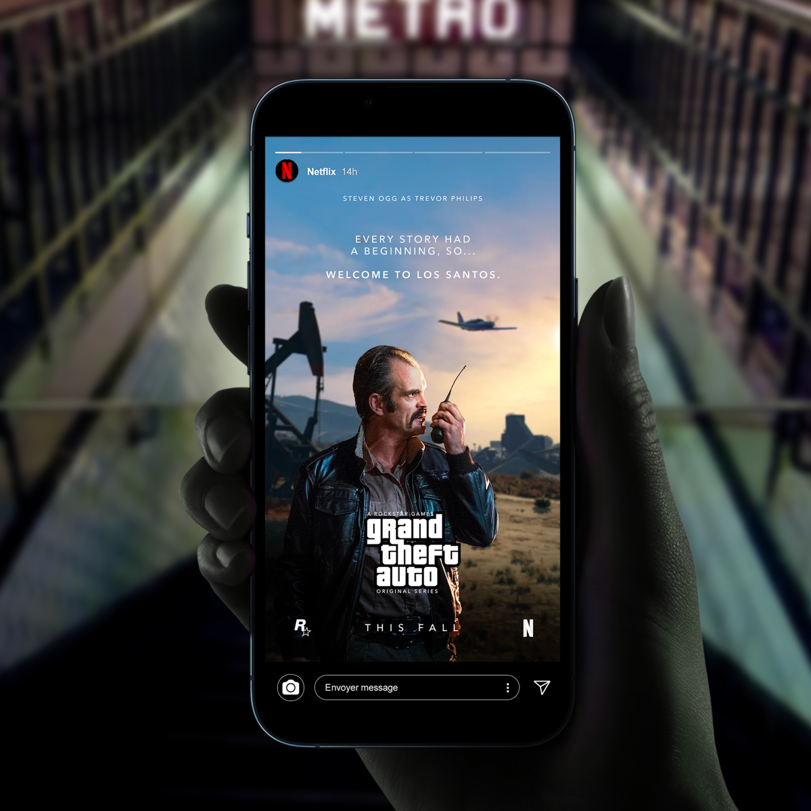 Campagne de lancement réalisée dans le cadre de l’annonce de l’adaptation fictive en série tv de la franchise de jeu vidéo Grand Theft Auto pour la plateforme de streaming Netflix.