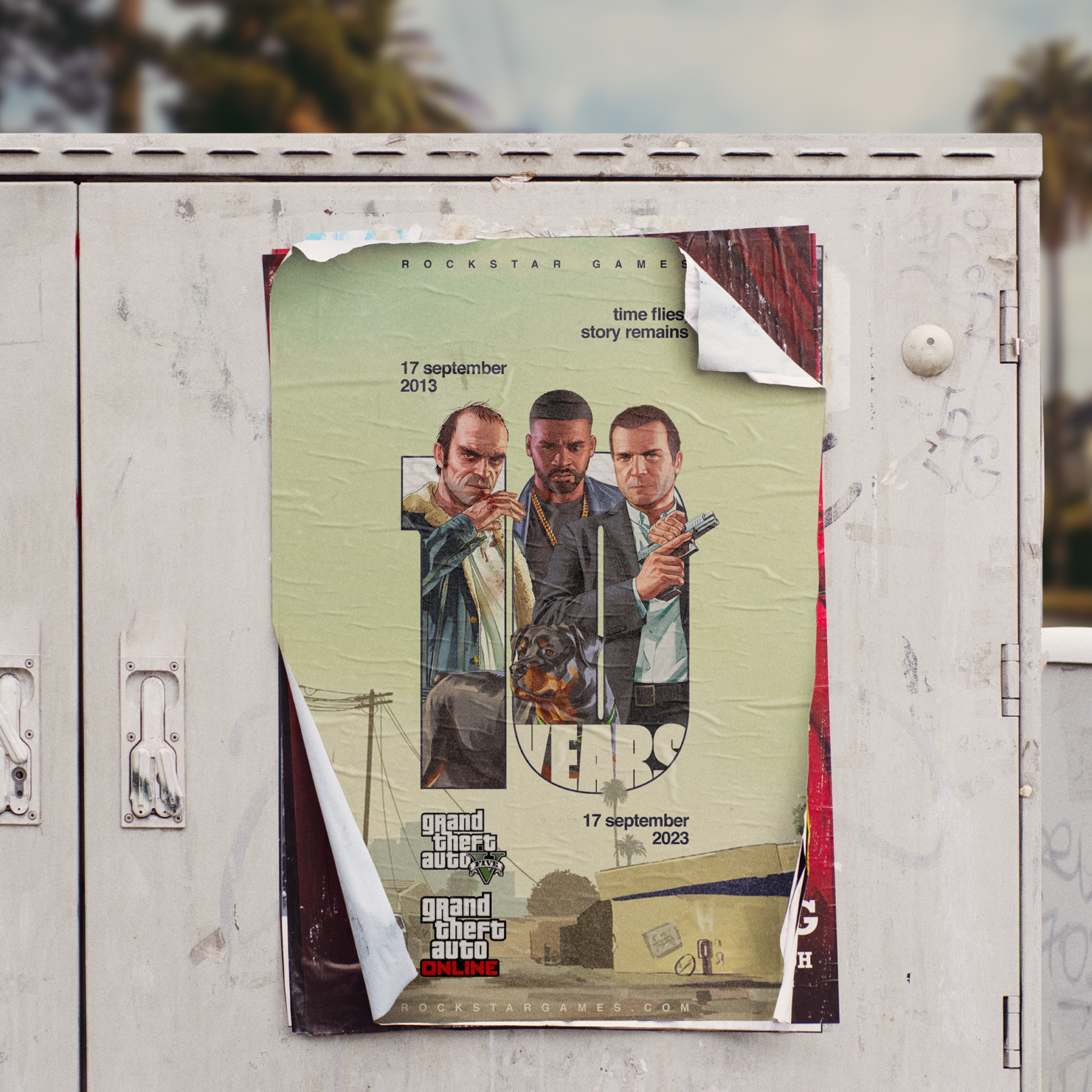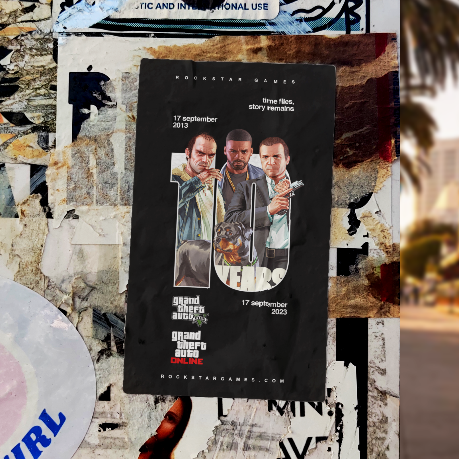 Campagne marketing anniversaire pour célébrer les 10 ans de la sortie du jeu Grand Theft Auto V et Grand Theft Auto Online. Cet événement historique célèbre, d’une part, la plus grande longévité d’un jeu vidéo Rockstar Game, mais aussi, d’autre part, l’engouement intarissable des joueurs pour le dernier volet de la franchise vivant toujours au travers de l’extension Grand Theft Auto Online et de ses multiples rééditions.